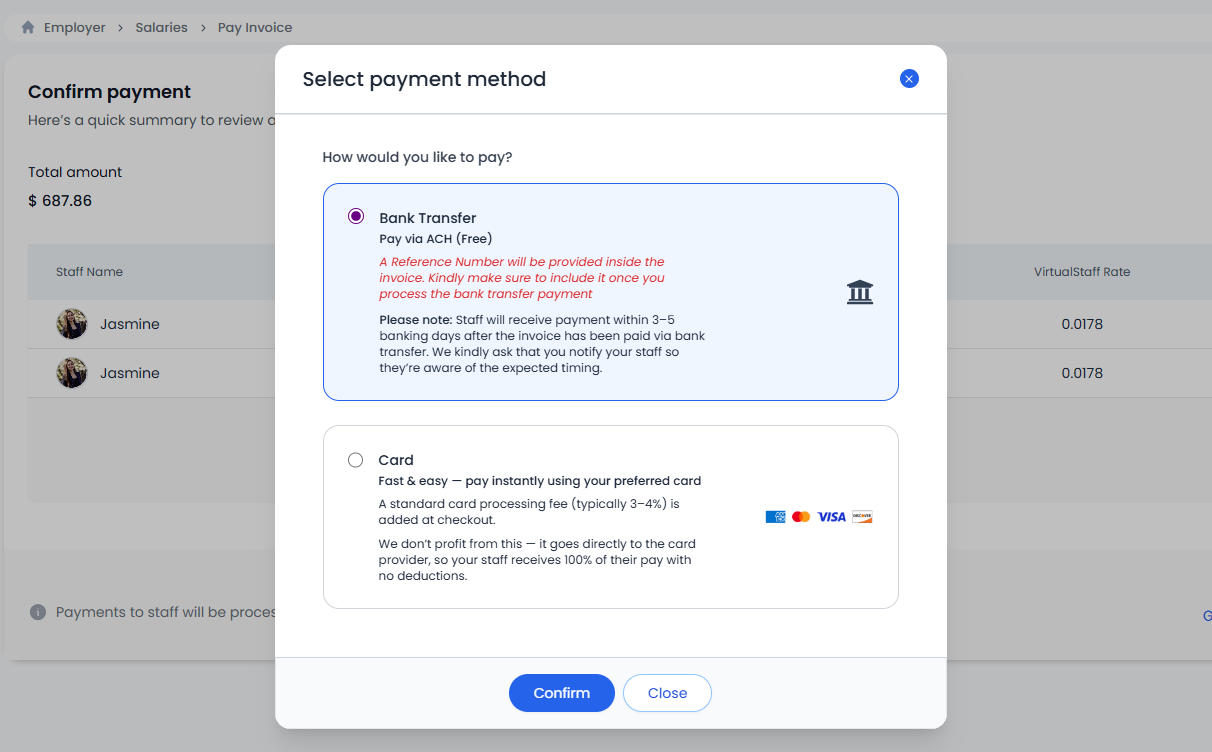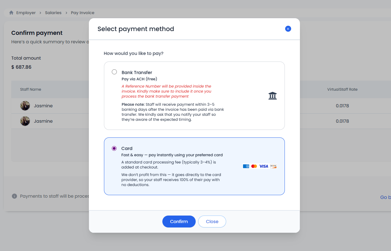 - Review the payment summary, including total amount and VirtualStaff rate.