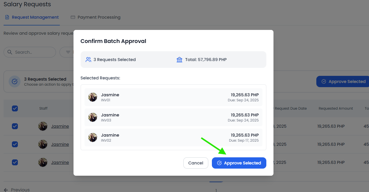 - A pop-up will appear showing the selected salary requests, total amount, and staff details.
