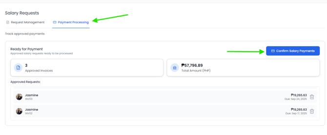 4. Once processed, the invoice status in the "Salaries" section will change to "Payment Processing."