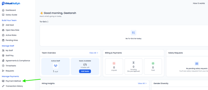 When you create your VirtualStaff employer account, you'll need to provide payment details for the Payment Verification process. However, if you ever need to update your card or modify your payment information, you can easily do so through your Dashboard.