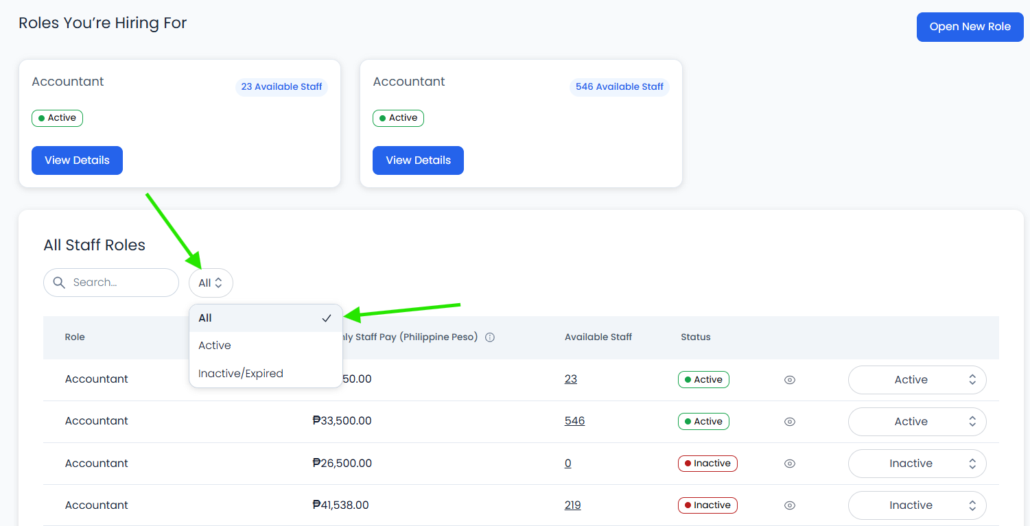 To see all past and current roles, simply use the filter option to show both active and inactive listings. Select 'All'.