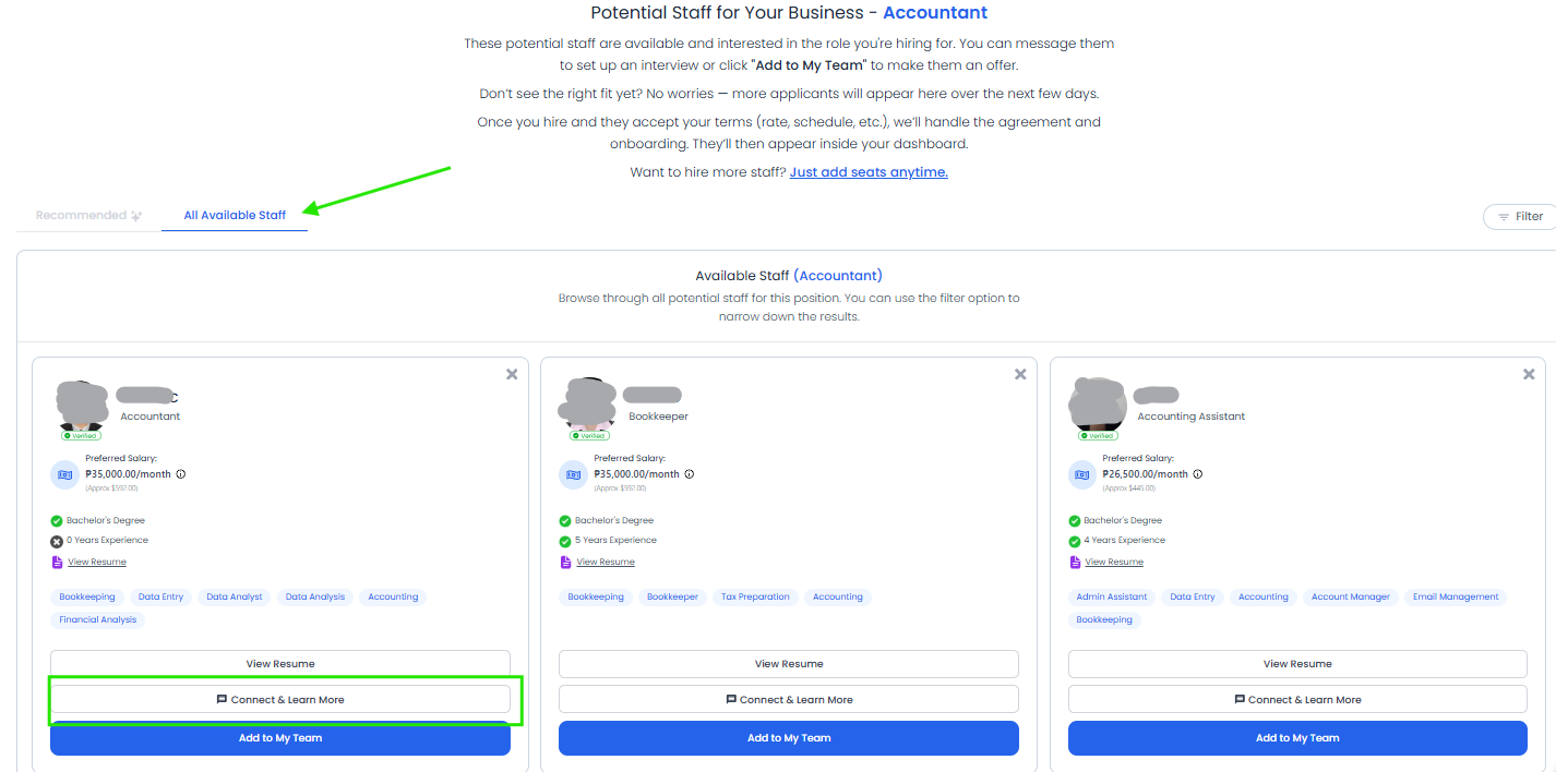 - Check the talents who expressed interest under 'All Available Staff' tab and click on the “Connect & Learn More” button to start a conversation.