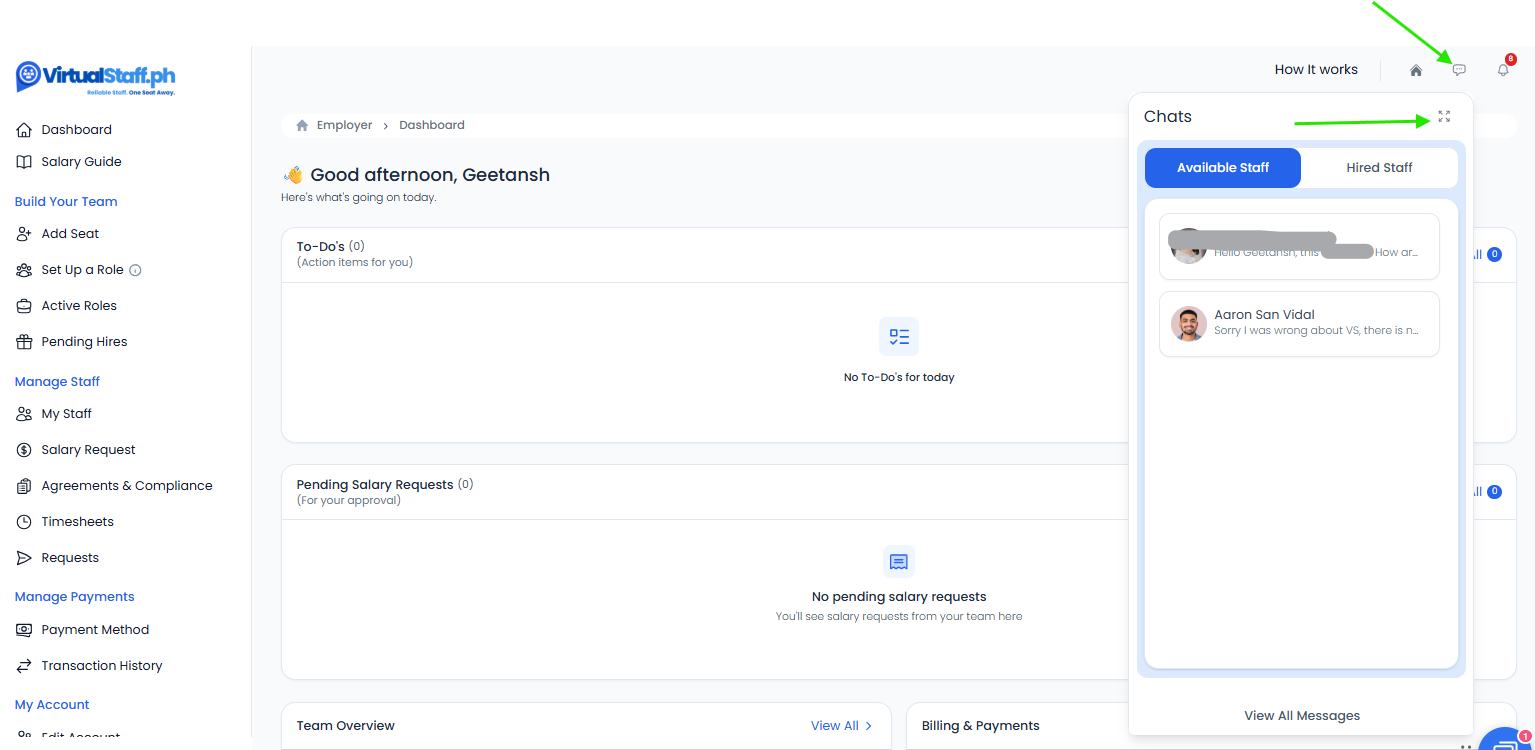 Once you've created a role, qualified and verified VirtualStaff talents will start expressing interest. To learn more about an potential staff or speed up communication, simply send them a message.