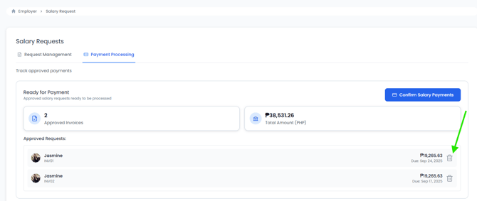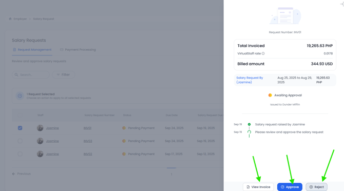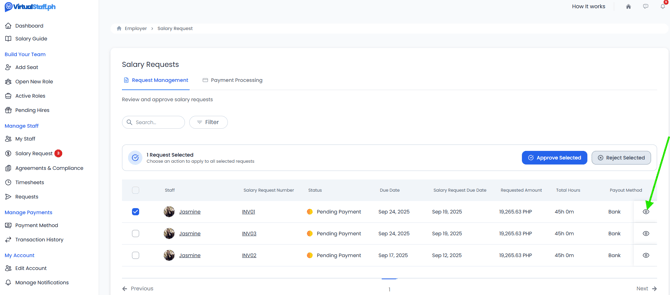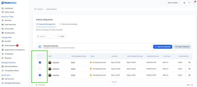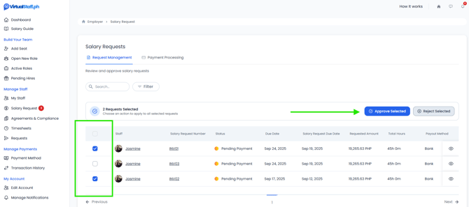 3. Locate the invoice that needs to be processed, check the boxes of the salary requests invoices you want to approve and pay.