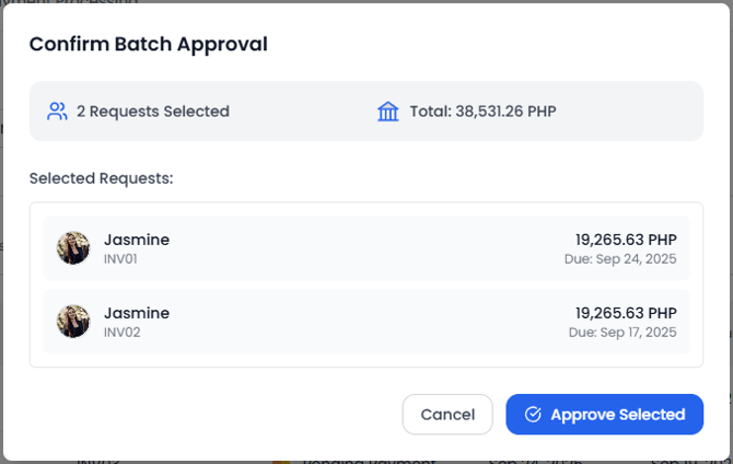 - Click Approve Selected, verify the final invoice details, then confirm approval.
