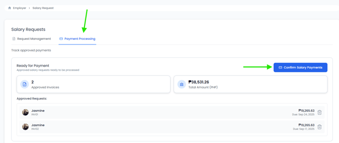 - From Payment Processing tab, click 'Confirm Salary Payments' tab.