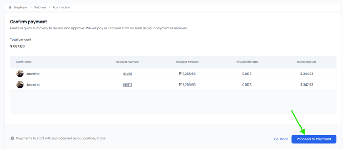 - Review the payment summary, including total amount and VirtualStaff rate.